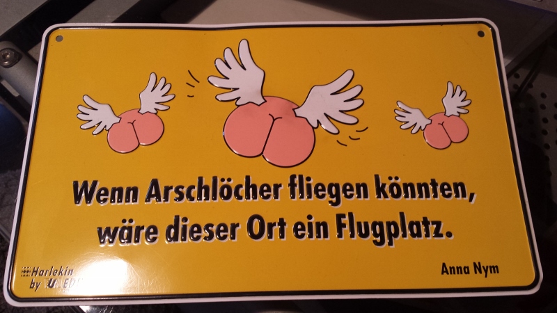 Unter all den Zwergen, putzigen Kätzchen und Pimmelfigürchen befand sich auch ein gelbes Schild. All die Jahre hatte es über ihrer Haustüre gehangen. Wenn ich sie jeweils besucht habe in ihrer verrauchten Wohnung, sind wir da gestanden und sie zeigte drauf und lachte. Ich fand es peinlich.
